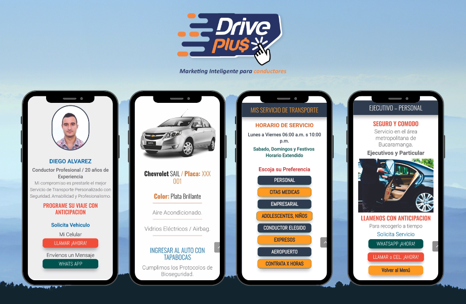 Diseño y desarrollo profesional del proyecto personalizado de la Plataforma DrivePlus para su empresa a través de un link que dirigirá a sus prospectos a su Portafolio Digital. Guia paso a paso para que haga la implementación del enlace en sus perfiles de redes sociales. Le compartiremos mediante una asesoría las estrategias orgánicas para que promueva su Plataforma Personal de Trnsporte en el entorno digital para el máximo provecho.